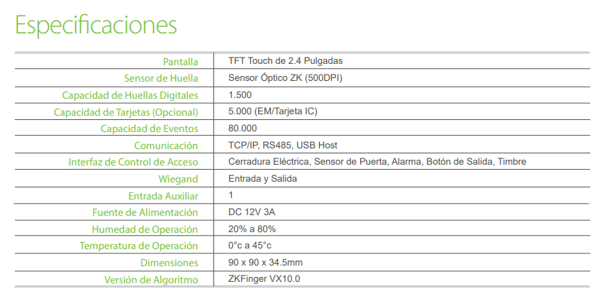 Características: Pantalla de 2.4” y sencilla interfaz de usuario para una fácil operación. Compacto y ligero Interruptor de sabotaje y salida de alarma. Entrada auxiliar incorporada para vinculación local. Interfaz de comunicación TCP/IP y RS485. Administración de datos por medio de USB. Hasta 15 métodos de multi-verificación. Características estándar de control de acceso. Múltiples idiomas.